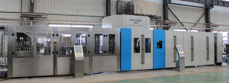 吹瓶部分實施了機械手雙層軌道曲線設計、吹瓶機模號加裝壓力檢測裝置、主吹輪氣源進出采用旋轉式動靜密封氣套(發明專利產品)、吹瓶機主吹輪采用旋轉式機械補償水套等多項技改措施,大大加強了吹瓶運行的安全性、穩定性,并延長了關鍵部件的使用壽命。